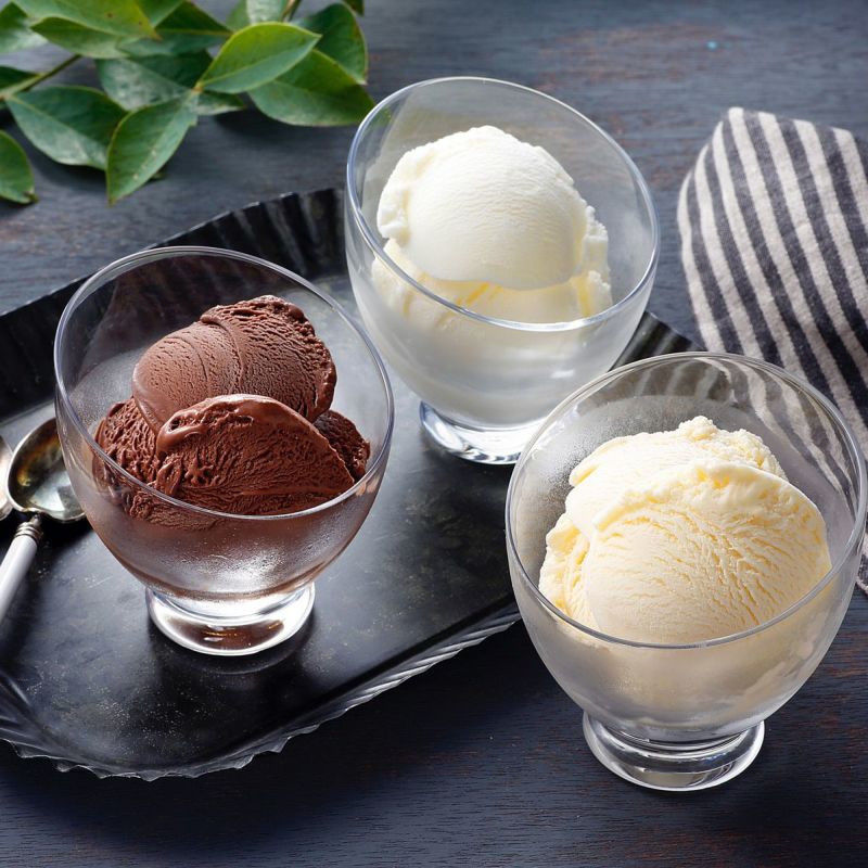 北海道産牛乳を使用した濃厚なプレミアムバニラ。チーズの程よい酸味を活かしたクリームチーズ、ちょっぴりビターなチョコの3種類のセットです。