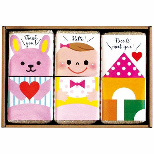 出産内祝いのお名入れギフトです。お米は新潟県産こしひかり無洗米を使用。お米の博士号五つ星マイスターが厳選したお米です。