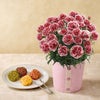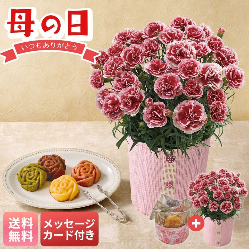 ■セット内容:カーネーション5号鉢、バスケット、お手入れのしおり、バラのフィナンシェ(フランボワーズ・抹茶・アプリコット・ダブルショコラ) ”商品サイズ:幅約15cm×高さ約30cm”