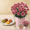 赤と白のコントラストが美しく見た目も華やかなカーネーションと「パティスリー モンシェール」バラのフィナンシェをセットでお届け。