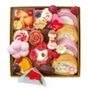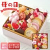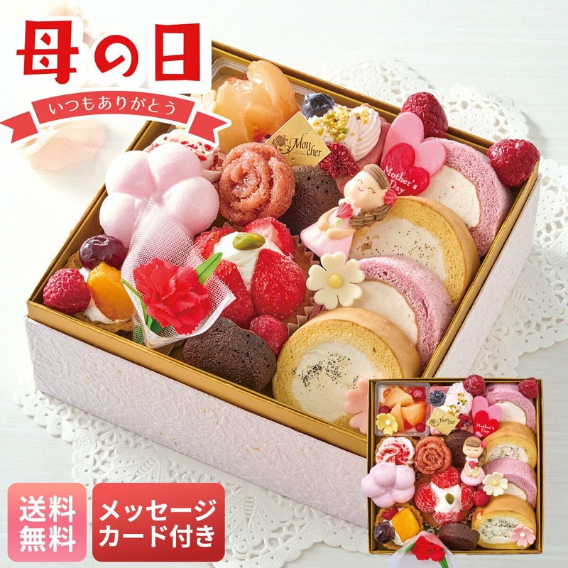 ■セット内容:ミニロール(バニラ・ベリー)×各2、フィナンシェショコラミニ×2、ムースピスタチオルージュ、桃プリン、ベリークリームタルト、梅ロッシェ、フルーツタルト、ストロベリーケーキ、ミニバラのフィナンシェ(フランボワーズ)、スマイルママ(砂糖菓子)、母の日ダブルハート(ハート型チョコ菓子)、お花型チョコ(ピンク・白・黄)、果実(フランボワーズ×5・ブルーベリー)、造花(カーネーションピック)