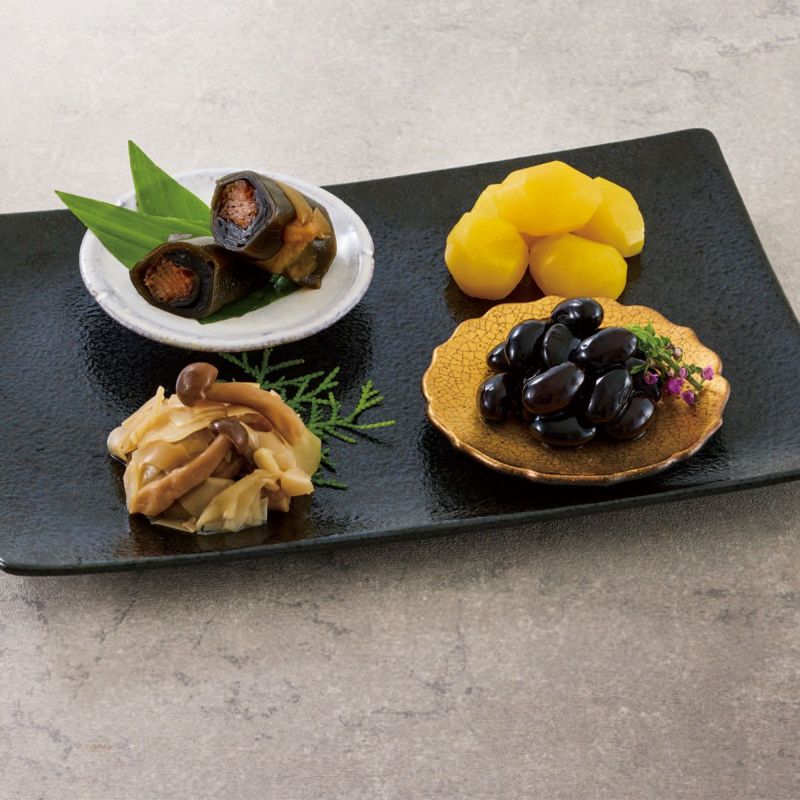 京都の料亭が作るおせち料理の贈り物です。丹波黒大豆を使用した黒豆、しめじを使用した炊合せなどを華やかに詰合せております。