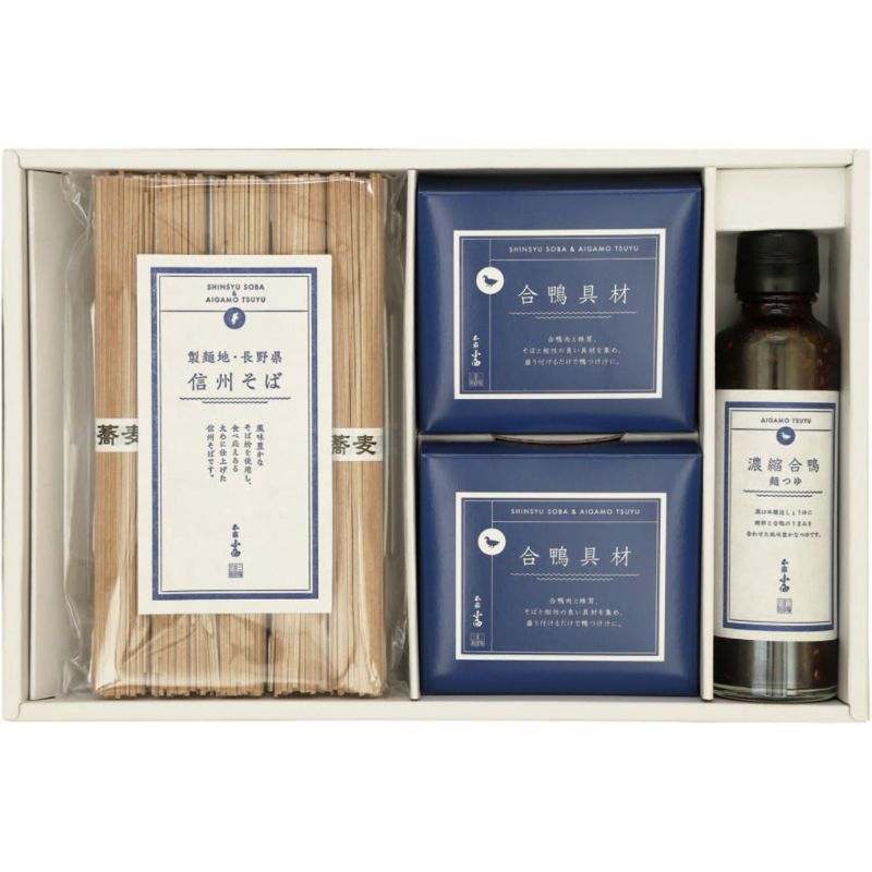 信州そばに合鴨つゆと具材(合鴨肉・椎茸)を詰め合わせた商品です。