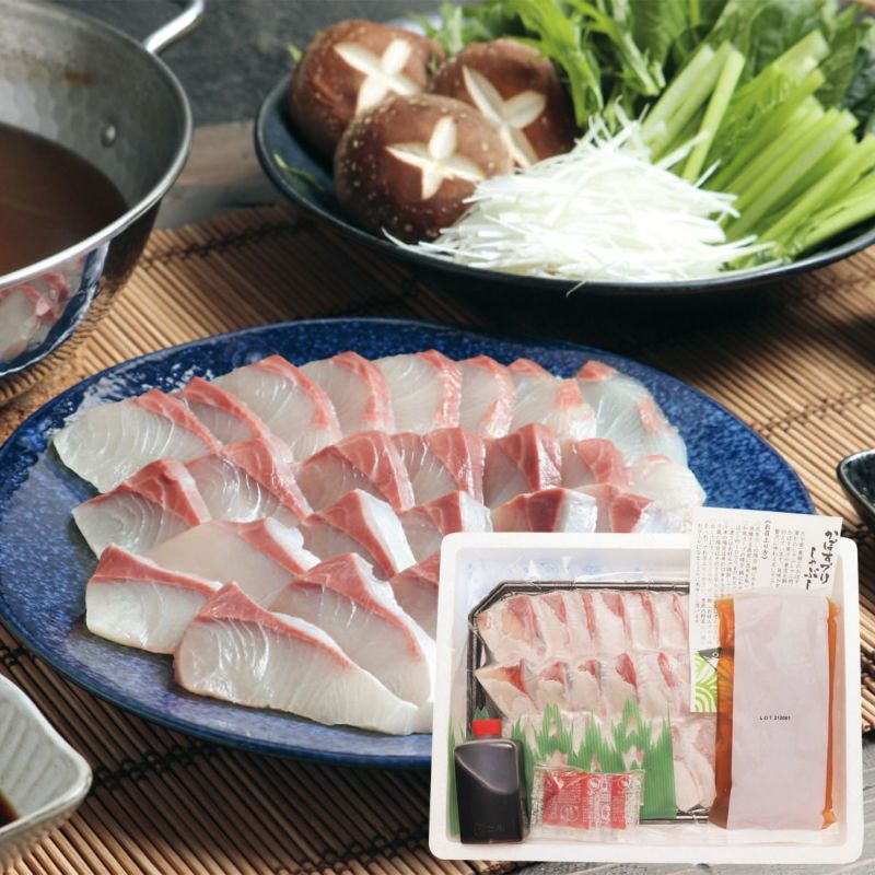 大分県のブランド魚かぼすブリをしゃぶしゃぶ用に薄引きにしてオリジナルの魚介だしたっぷりの和風スープをベースにした鍋セットにしました。