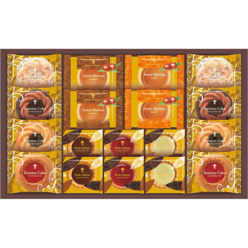ロシアケーキ(リッチビター・フラワーキウイ・マカロンストロベリー・ホワイトチョコ)×各2、プチガトー(ストロベリー・ミルクチョコ・ホワイトチョコ)×各2、スイートマロン(メイプル・キャラメル)×各2