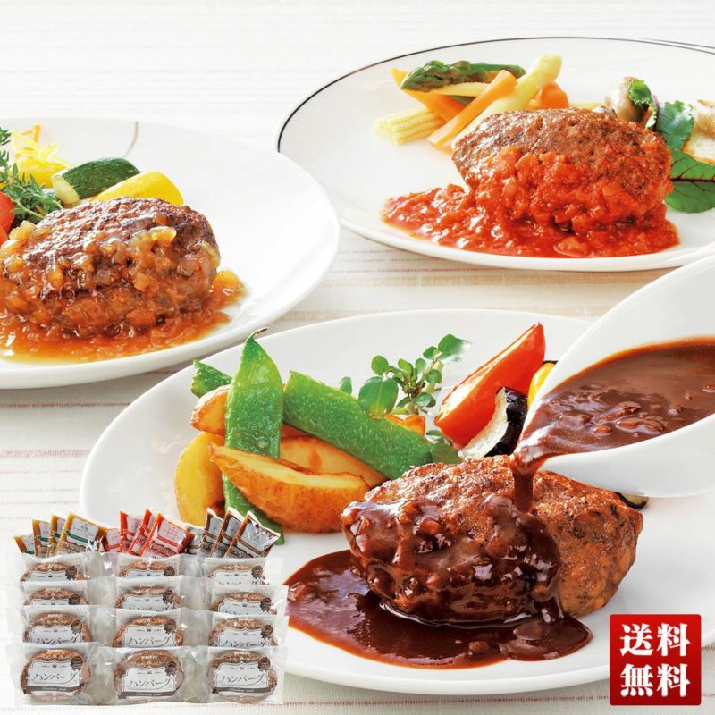お肉の旨みがぎゅーっと詰まったハンバーグ12食+3種のソース付き。牛肉7:豚肉3の黄金比で配合。真空調理でうま味を閉じ込めたハンバーグです。