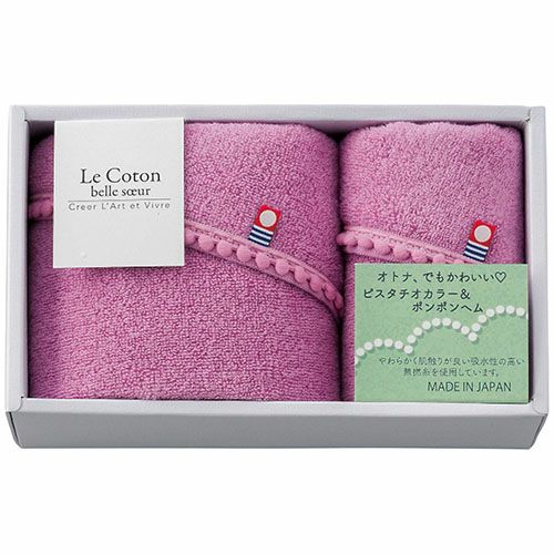 大人っぽいピスタチオカラーに可愛らしいポンポンを付けたタオルです。やわらかくて肌触りの良い無撚糸を使用しています。