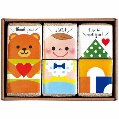 出産内祝いのお名入れギフトです。お米は新潟県産こしひかり無洗米を使用。お米の博士号五つ星マイスターが厳選したお米です。