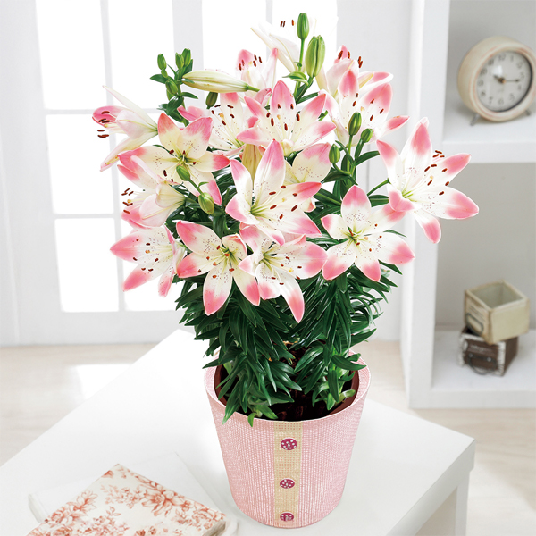 クリーム色とピンク色の2色咲きが魅力のスカシユリです。通常のユリと比べ背丈が低く、コンパクトにまとまります。切花としてもお楽しみいただけます。